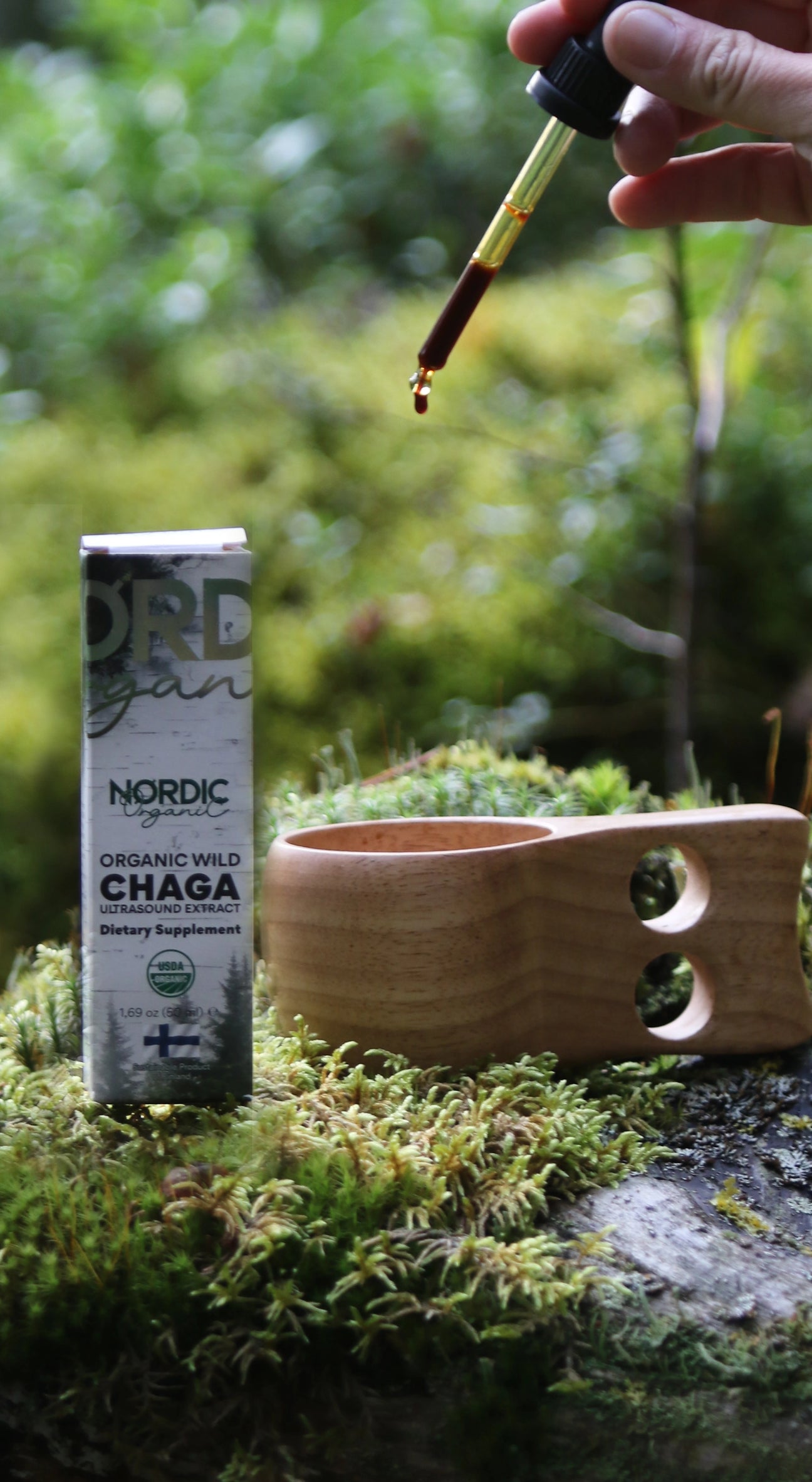 Chaga comes from our own ultrasound extract made from mushrooms foraged in above arctic circle.