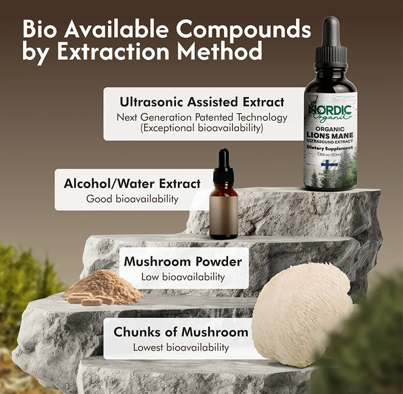 • Compound Release: The primary advantage for bioavailability comes from the efficient release of compounds from the tough chitin matrix. Many of these compounds would otherwise remain locked within the mushroom material and pass through the human digestive system largely "untapped." UAE essentially "unlocks" them.