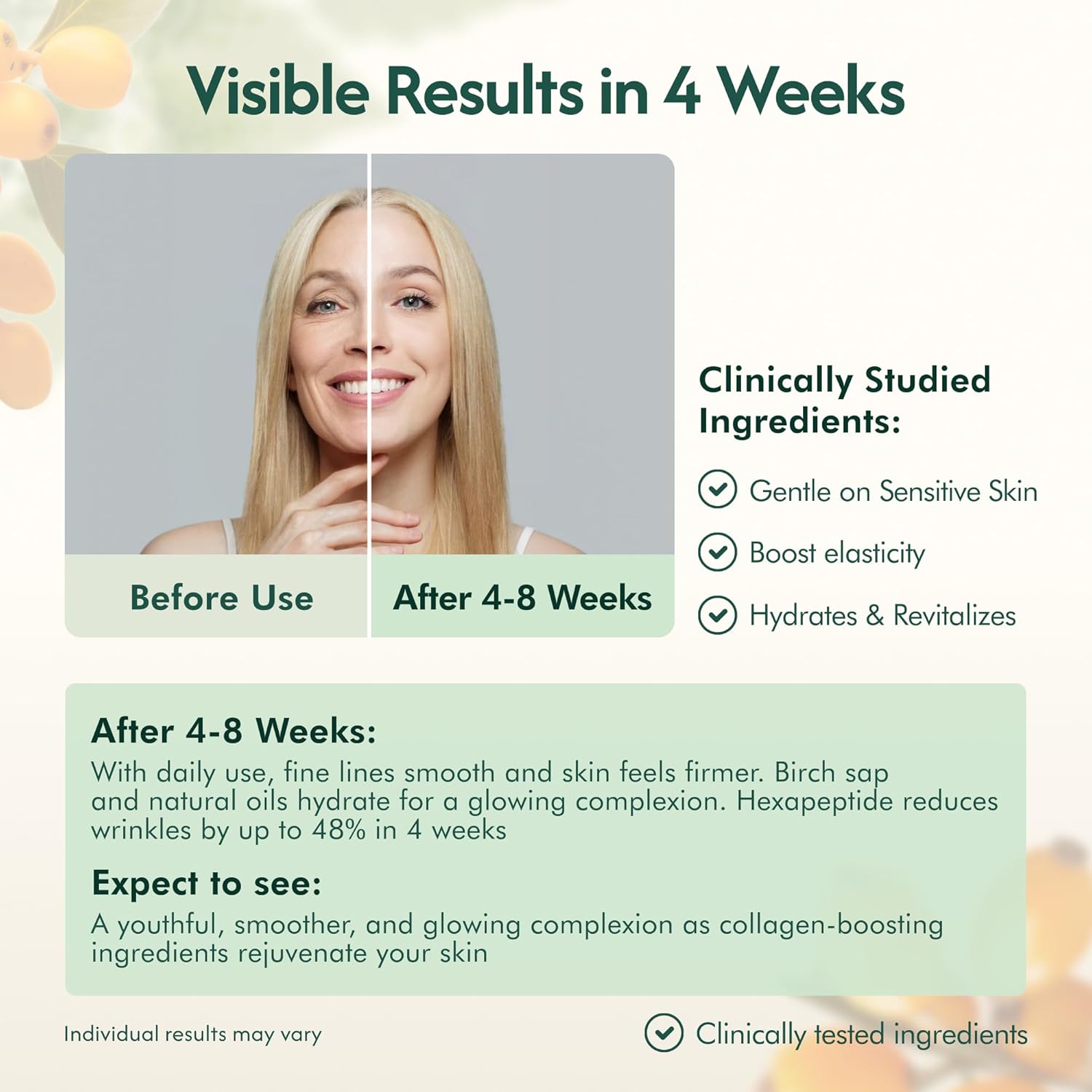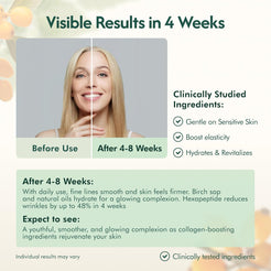 You’ll notice immediate benefits like deep hydration and a dewy radiance after each use, as the birch sap and natural oils plump and soften your skin. With consistent daily use, expect to see fine lines start to smooth and skin feel firmer within a few weeks. In fact, the hexapeptide in our formula has been clinically shown to reduce the appearance of wrinkles by up to 48% in just four weeks of use. By 4–8 weeks, you can anticipate a visible boost in elasticity and firmness as collagen-supporting ingredients like the peptide, arginine, and CoQ10 work to rejuvenate your skin. Remember that individual results may vary, but healthier, more resilient skin with a youthful glow is our goal with this cream.
