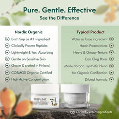 Our Birch Sap Face Cream is proudly COSMOS Organic certified by ECOCERT, which guarantees the product meets the highest standards for natural and organic cosmetics. This means at least 95% of its plant ingredients are certified organic, and the formulation is made in an environmentally friendly way. The ECOCERT/COSMOS seal assures you there are no GMOs, parabens, synthetic fragrances, or other petrochemicals in the cream – and that sustainable practices and recyclable packaging are used to minimize environmental impact. The cream is also 100% vegan and cruelty-free, containing no animal-derived ingredients and never being tested on animals. Additionally, “sustainably made in Finland” isn’t just a tagline – it reflects our commitment to eco-conscious manufacturing. Our products are crafted in Finland with green energy and responsible processes (some Finnish brands even achieve carbon-neutral production). So when you use this cream, you can feel good knowing it’s not only premium in quality and efficacy, but also ethically made with respect for animals and the planet.