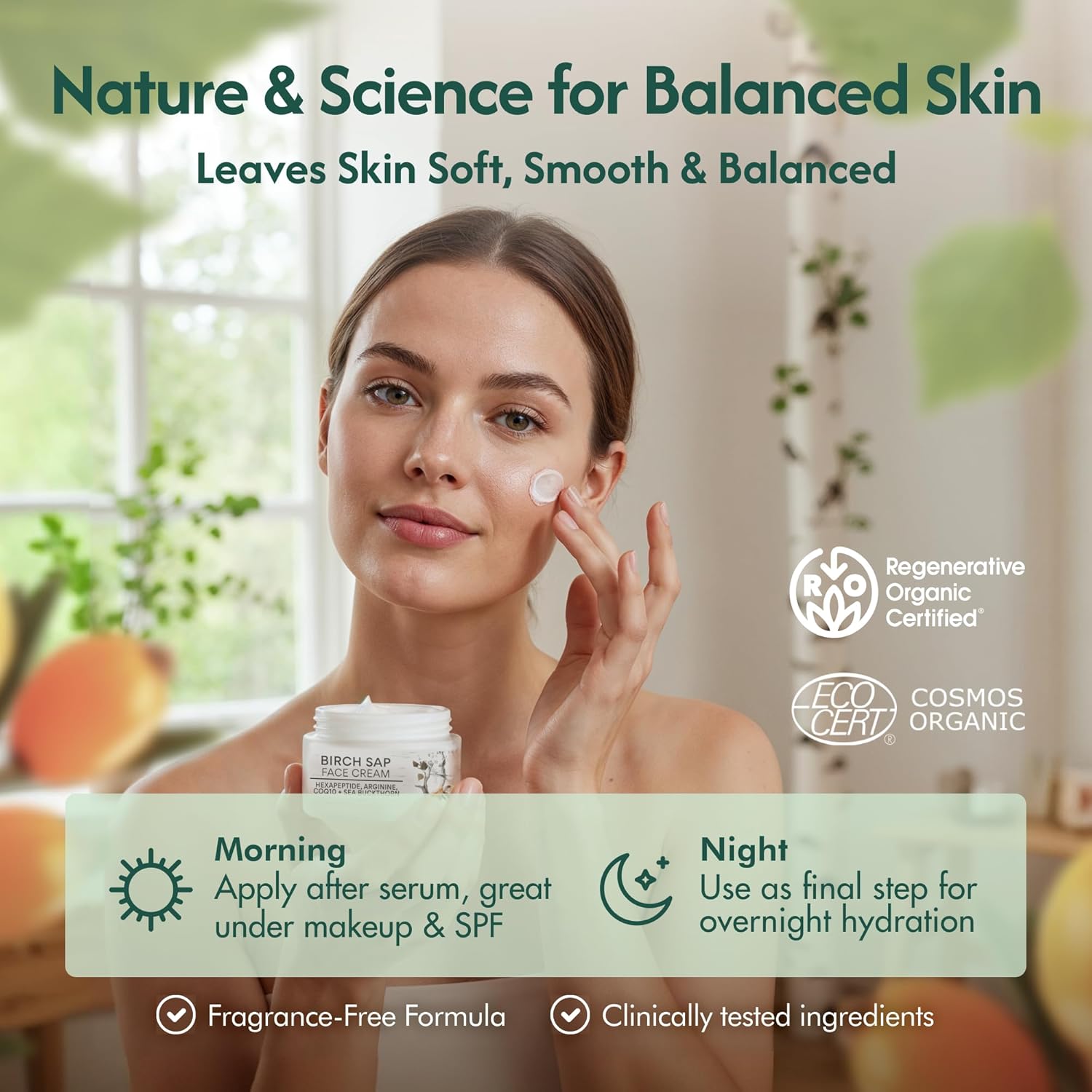Yes. This formula is dermatologically tested to be gentle and is suitable for all skin types – from dry to oily – and even sensitive or reactive skin. It contains no harsh chemicals or synthetic fragrances, and instead relies on soothing natural ingredients like birch sap and botanical oils to nurture the skin. The cream helps calm redness and irritation while balancing hydration, so even sensitive skin feels comfortable and cared for. If you have extremely reactive skin, we always recommend a patch test, but our product was crafted to minimize the risk of irritation.